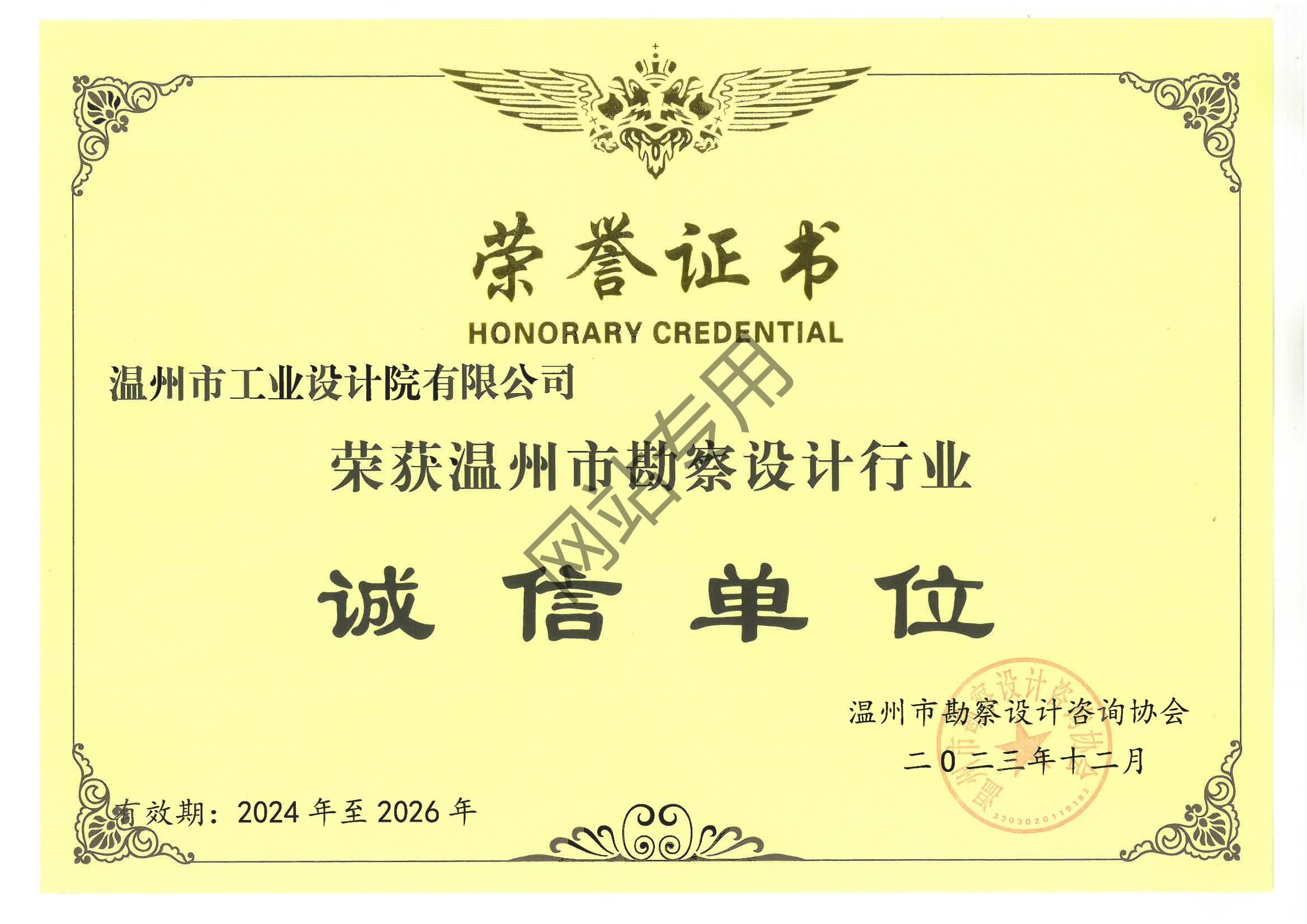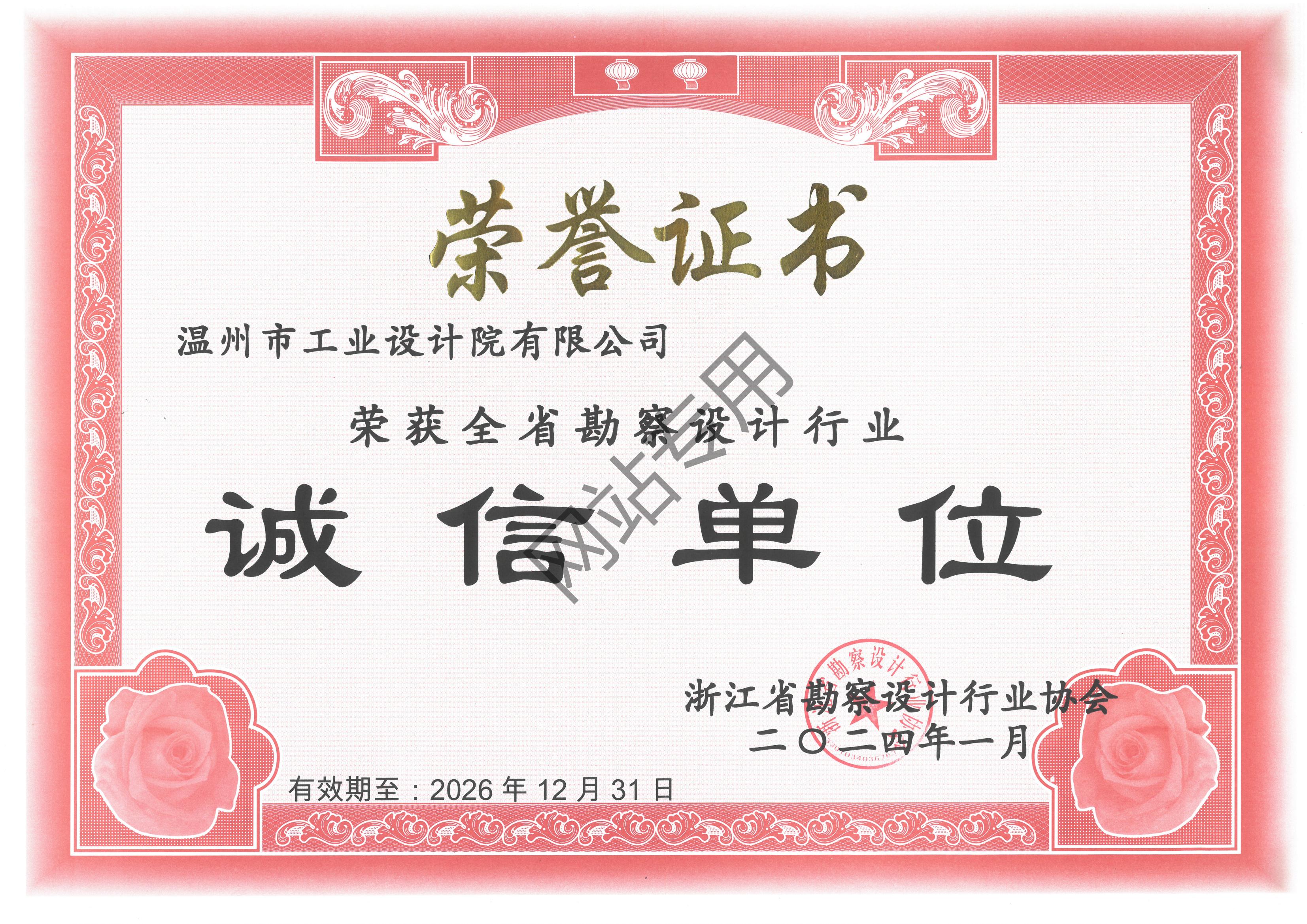 溫州市勘察設(shè)計(jì)行業(yè)誠信單位證書2024-2026