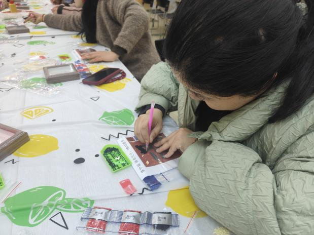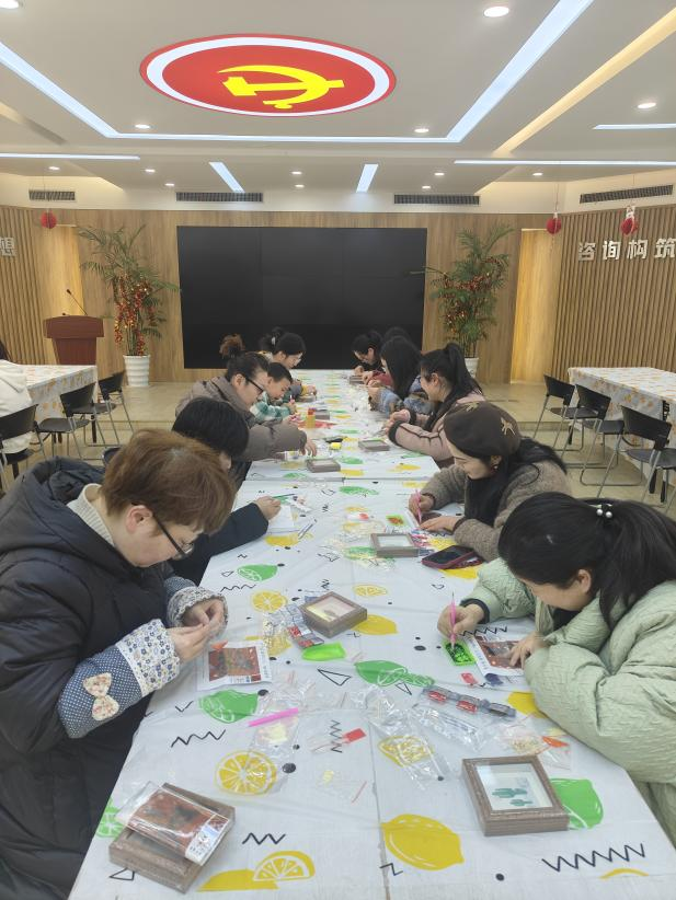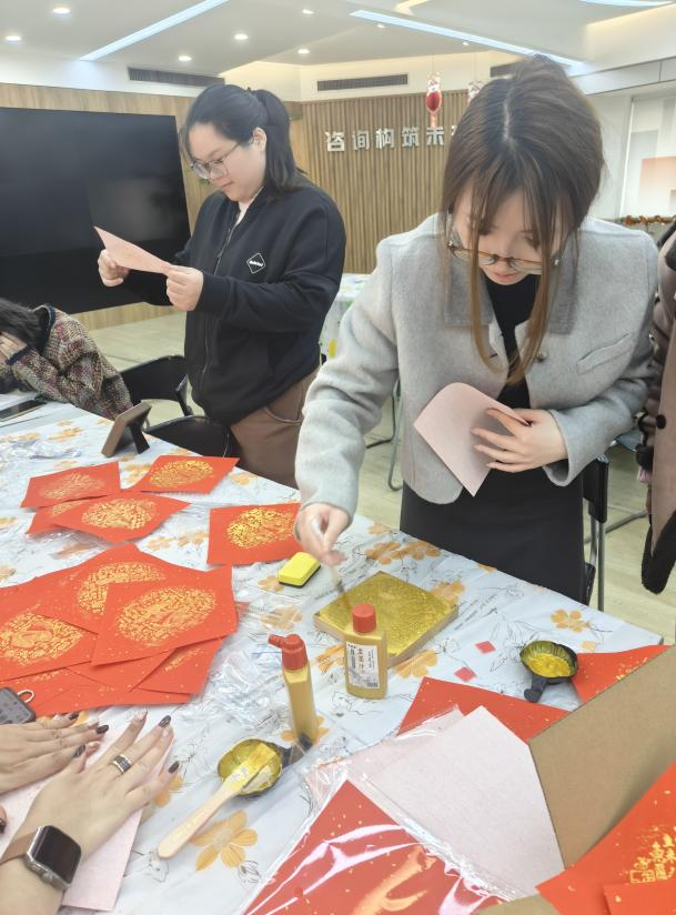 活動現(xiàn)場,布置得溫馨且喜慶,燈籠高掛、春聯(lián)映目、年花簇擁,處處洋溢著濃郁的節(jié)日氣息。全體員工熱情響應(yīng),踴躍參加?;顒右潦迹蠹矣行蚝灥讲㈩I(lǐng)取了手工DIY所需的材料。此次活動準備了多個富有傳統(tǒng)文化韻味的手工項目。福字 DIY 鉆石貼區(qū),員工們專注地將一顆顆閃耀的鉆石鑲嵌在特制模板上,在細致操作中,寓意吉祥的福字逐漸成型;“家和萬事興”“百福圖” 數(shù)字油畫 DIY 區(qū)域,大家依據(jù)數(shù)字標識,用畫筆為畫布填充色彩,每一筆都飽含著對美好生活的期許。木版年畫拓印手工 DIY 處,員工們先將宣紙輕柔覆蓋在刻有精美圖案的木版上,再用蘸滿顏料的刷子均勻刷過紙面,隨后小心翼翼地揭開宣紙,一幅幅承載著歷史記憶與美好寓意的木版年畫便躍然紙上 。經(jīng)過一個多小時的創(chuàng)作,一幅幅精美的手工作品陸續(xù)誕生。這些作品不僅展示了員工們的才華和技藝,更凝聚了大家的智慧和汗水。